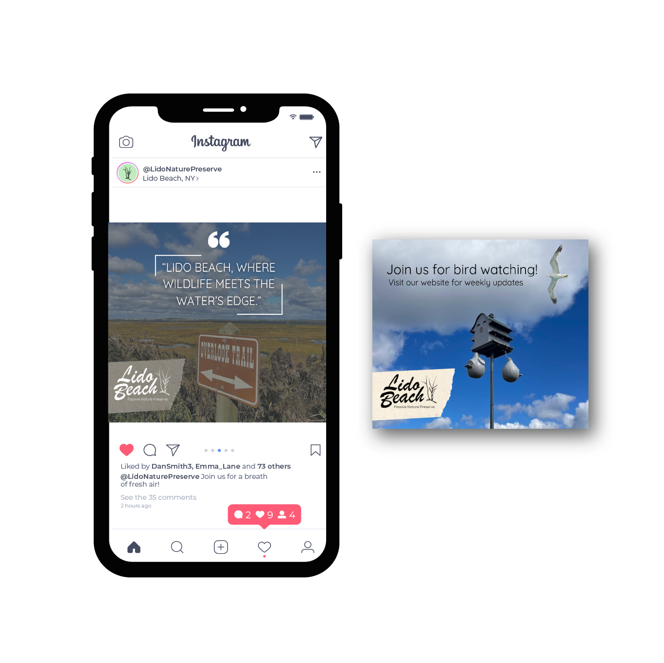 This Passive Nature Preserve is located in Lido Beach, NY. Showcasing a logo redesign and social media mockup posts promoting foot traffic to the preserve.