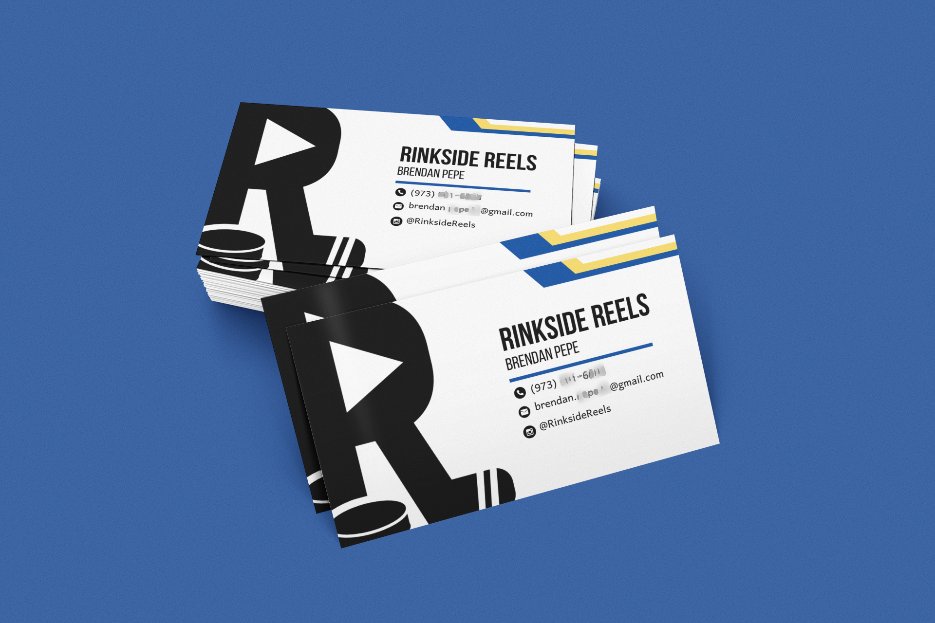 Logo and business card design used for Rinkside Reels. Rinkside Reels creates highlight tapes to help hockey players advance their careers and offers personalized 1-on-1 Zoom film coaching sessions for in-depth skill analysis.
